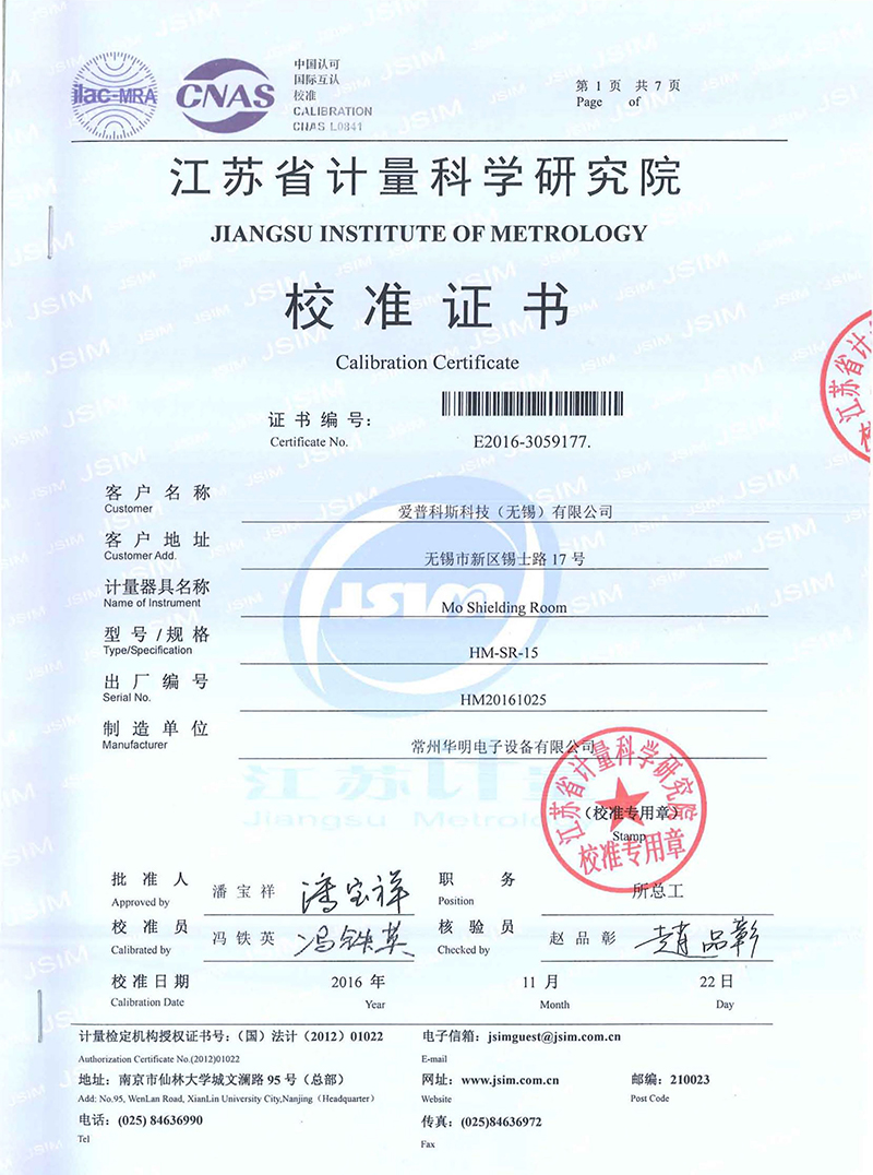 屏蔽室校準證書